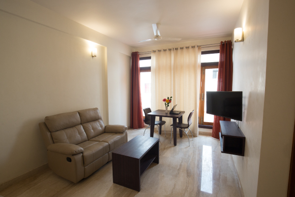 Spacious 1 BHK serviced apartments with Living-dining, Bedroom with attached bathroom, Kitchenette, and balcony. Enjoy home-like comfort and easy access at your convinent.